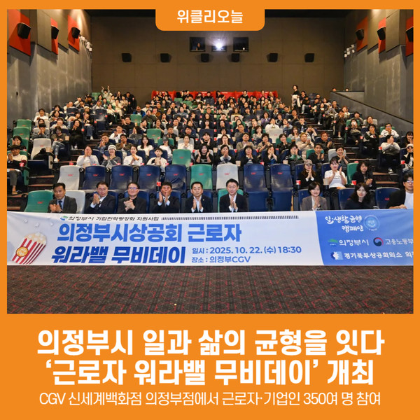 [경기 위클리오늘=우서연 기자] 의정부시는 10월 22일 CGV 신세계백화점 의정부점에서 ‘근로자 워라밸 무비데이’ 행사를 성황리에 개최했다.